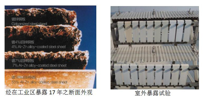 鍍55%鋁鋅鋼卷已在各種不同的大氣環(huán)境中,進(jìn)行了20多年的室外曝曬試驗(yàn),證實(shí)鍍55%鋁鋅鋼板的切邊保護(hù)能力,比鍍鋅鋼板及鍍5%鋁鋅鋼板為佳。