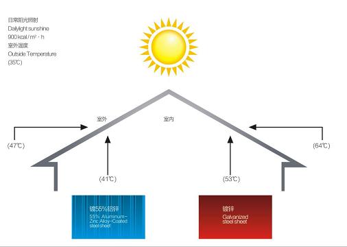 鍍55%鋁鋅合金鋼板具有高度反射性,使其成為抗熱的屏障。